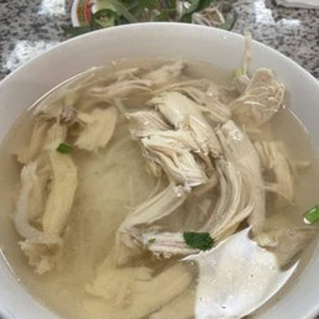 A flavorful Vietnamese noodle soup featuring a delicate and aromatic chicken broth, tender shredded chicken, rice noodles, and garnished with fresh herbs like cilantro, Thai basil, and bean sprouts. Served with a side of lime wedges, jalapenos, and hoisin and sriracha sauces for customization.