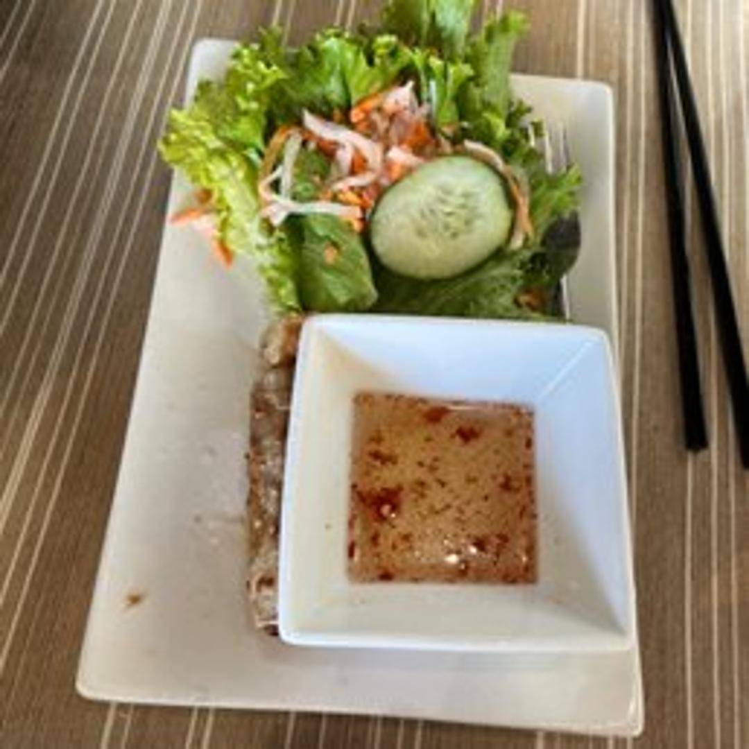 Two crispy fried egg rolls filled with a mixture of ground pork, shrimp, vegetables, and glass noodles. Served with nuoc cham dipping sauce.