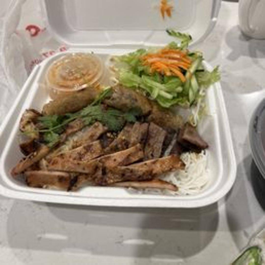 A refreshing Vietnamese noodle salad featuring cold vermicelli noodles, grilled beef, crisp lettuce, pickled carrots and daikon, cucumbers, and fresh herbs. Topped with roasted peanuts and served with a side of flavorful Vietnamese fish sauce (Nuoc Cham).