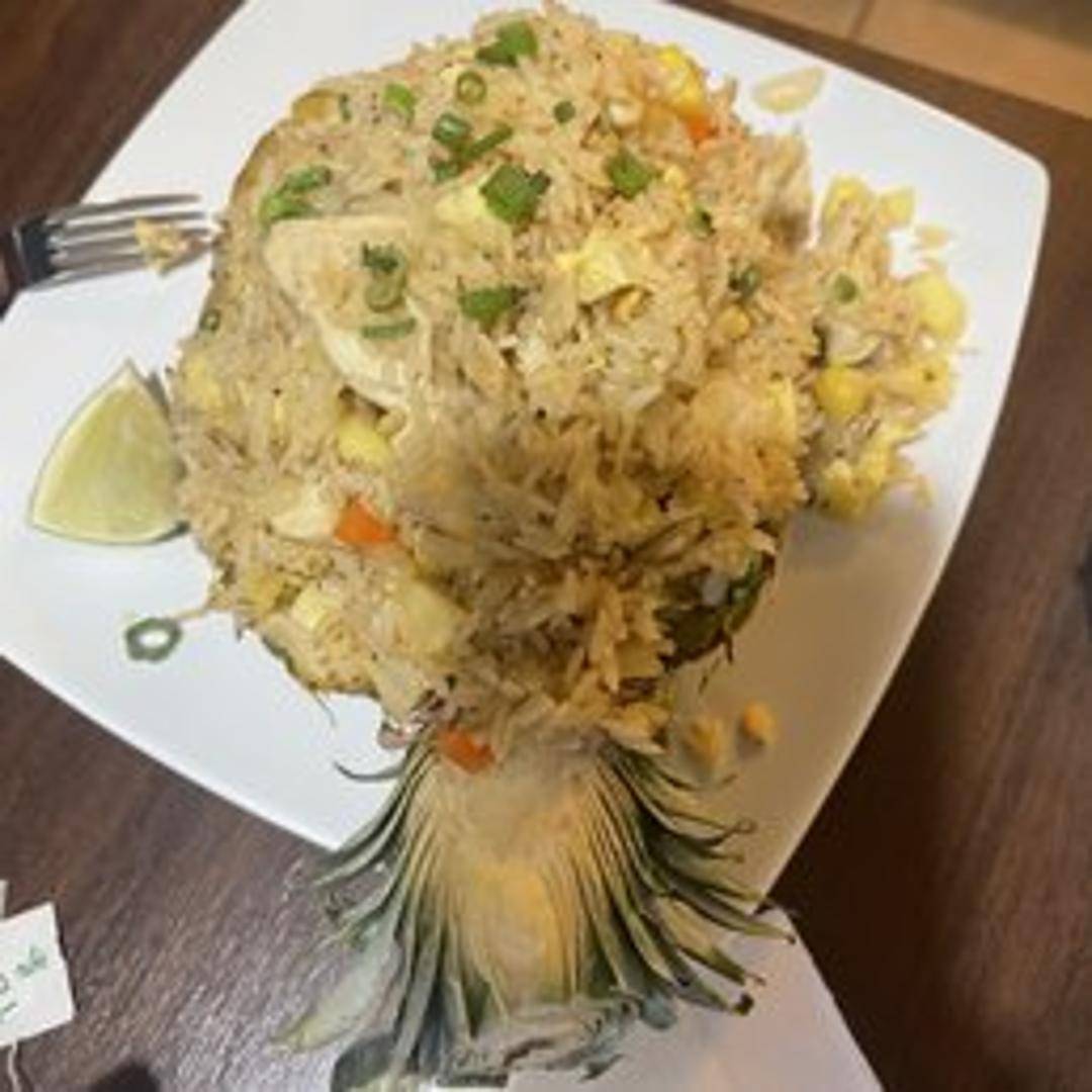 Stir-fried rice with shrimp, chicken, pineapple, cashew nuts, raisins, and vegetables. Served in a pineapple shell.