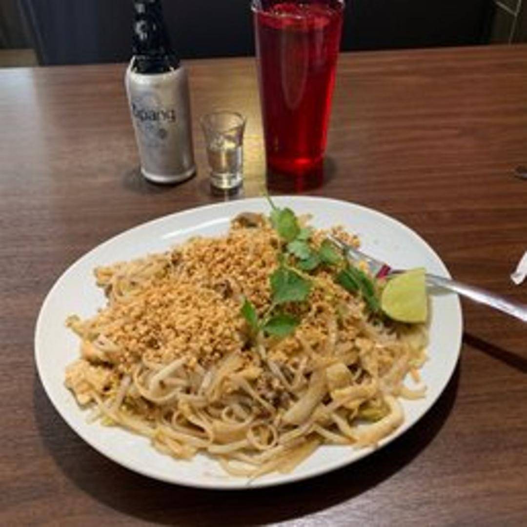 Stir-fried rice noodles with shrimp, chicken, egg, bean sprouts, and peanuts in a tangy tamarind sauce.
