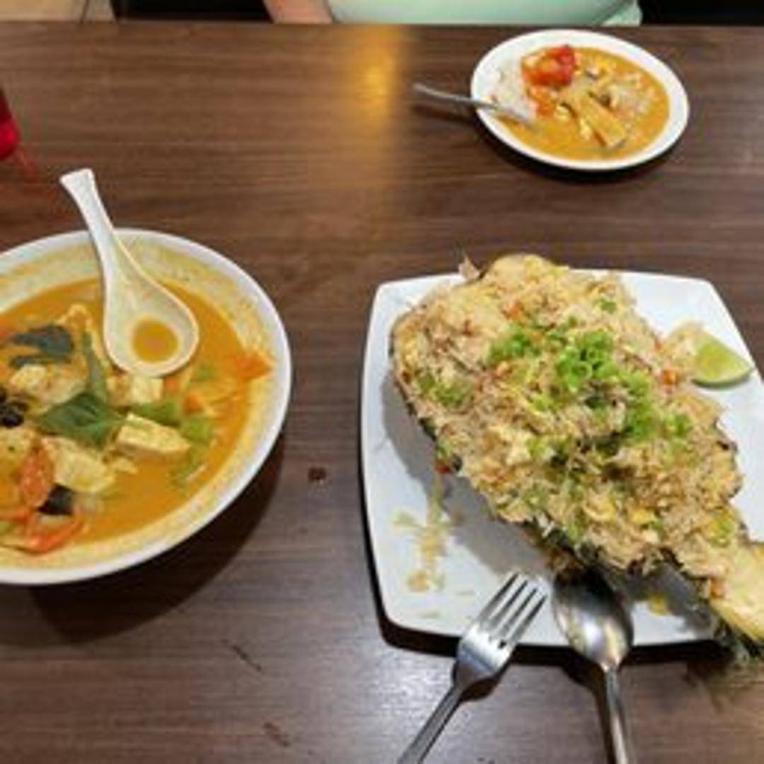 A creamy and fragrant Thai curry made with coconut milk, Panang curry paste, your choice of protein, bell peppers, and basil leaves. Served with steamed rice.