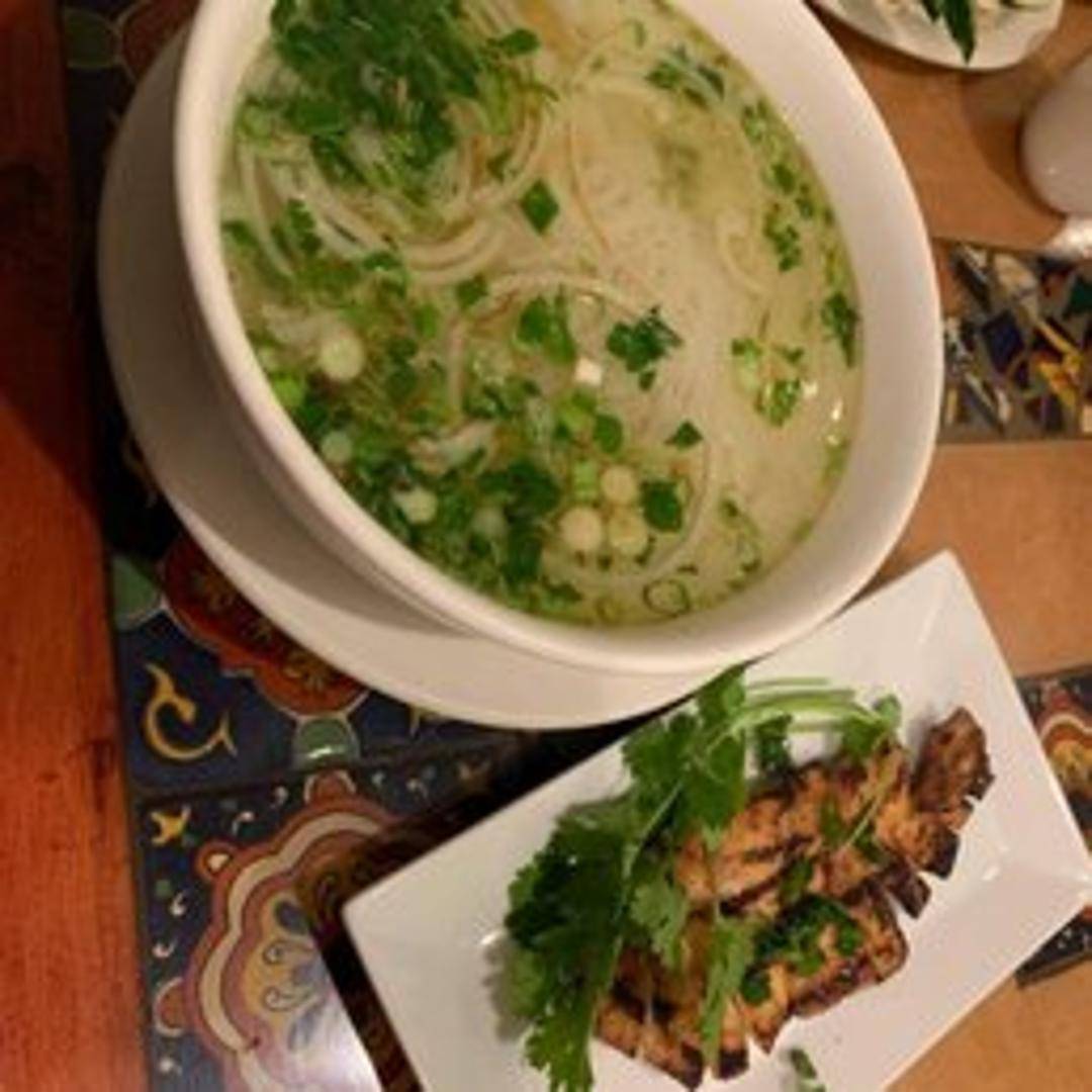 A delectable Vietnamese noodle soup showcasing a savory broth, rice noodles, and grilled chicken (Ga Nuong). Served with a side of fresh herbs, bean sprouts, lime, and jalapenos, providing a refreshing contrast and customizable flavor profile to this Vietnamese specialty.
