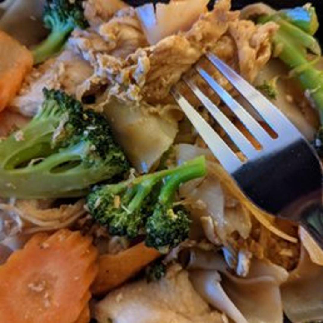 Wide rice noodles stir-fried with Chinese broccoli, egg, and your choice of protein (chicken, pork, beef, or tofu) in a sweet soy sauce.