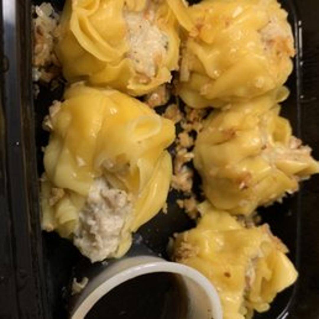 Steamed dumplings filled with seasoned ground pork and shrimp, topped with fried garlic and served with a sweet soy sauce.