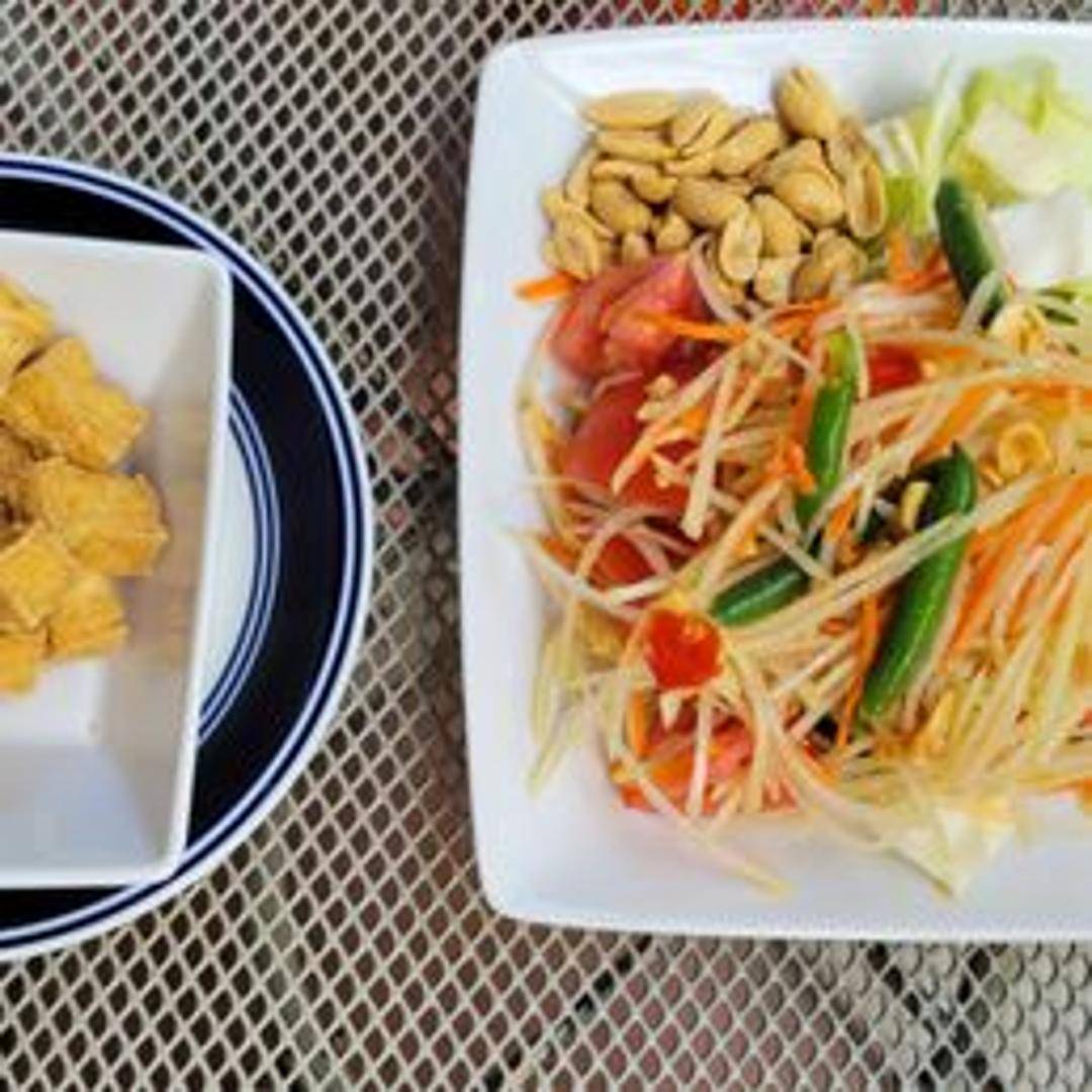 A spicy and refreshing salad made with shredded green papaya, tomatoes, green beans, peanuts, garlic, chili peppers, and a tangy fish sauce dressing.