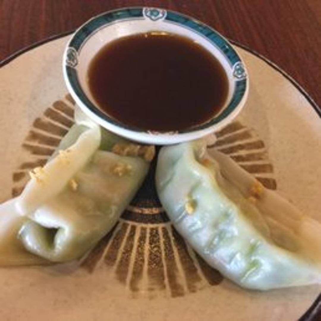 Pan-fried dumplings filled with seasoned ground pork and vegetables, served with a savory dipping sauce.