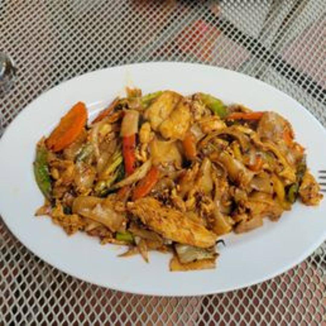 Wide rice noodles stir-fried with basil, bell peppers, onions, tomatoes, and your choice of protein (chicken, pork, beef, or tofu) in a spicy garlic sauce.