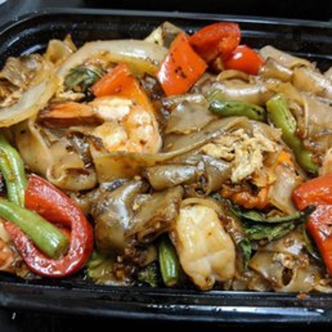 Wide rice noodles stir-fried with chili paste, vegetables (such as bell peppers, onions, and broccoli), basil, and your choice of protein. Can be quite spicy.