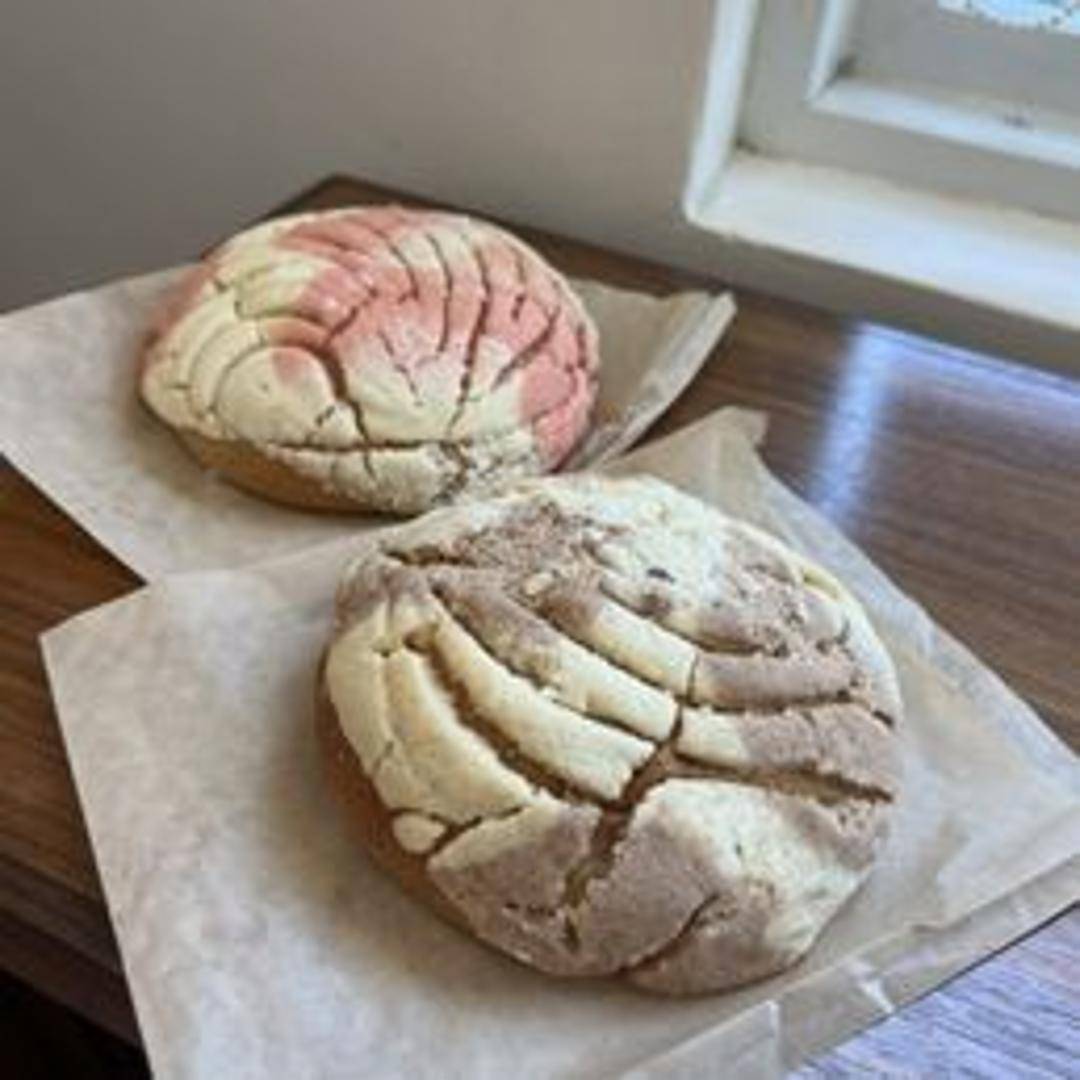 A sweet, shell-shaped Mexican bread roll (pan dulce) made entirely without animal products. Soft, fluffy, and topped with a distinctive sugar paste crust in a variety of flavors and colors.