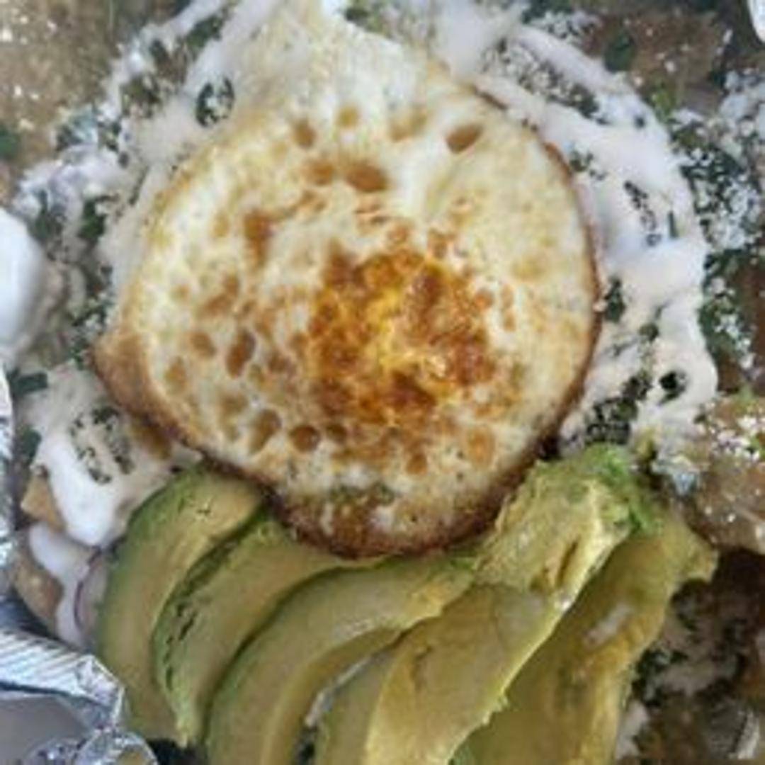 Crispy tortilla chips simmered in a creamy, tangy tomatillo sauce and topped with melted cheese (dairy, please confirm vegan option availability), onions, and cilantro. Served with a side of crema and a fried egg (please confirm vegan option availability).