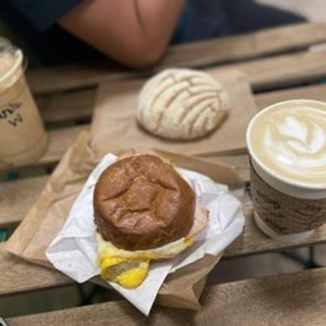 A savory breakfast sandwich featuring your choice of freshly baked bread, filled with scrambled eggs, melted cheese, and your choice of breakfast meat (such as bacon, sausage, or ham). May include additions like sliced tomatoes, avocado, or a flavorful aioli.