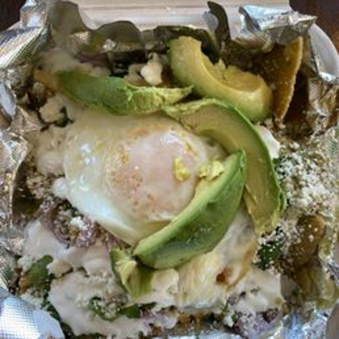 Crispy tortilla chips simmered in a vibrant green tomatillo sauce. Topped with shredded chicken or eggs, crumbled queso fresco, crema, and thinly sliced onions. A savory and comforting Mexican breakfast staple.
