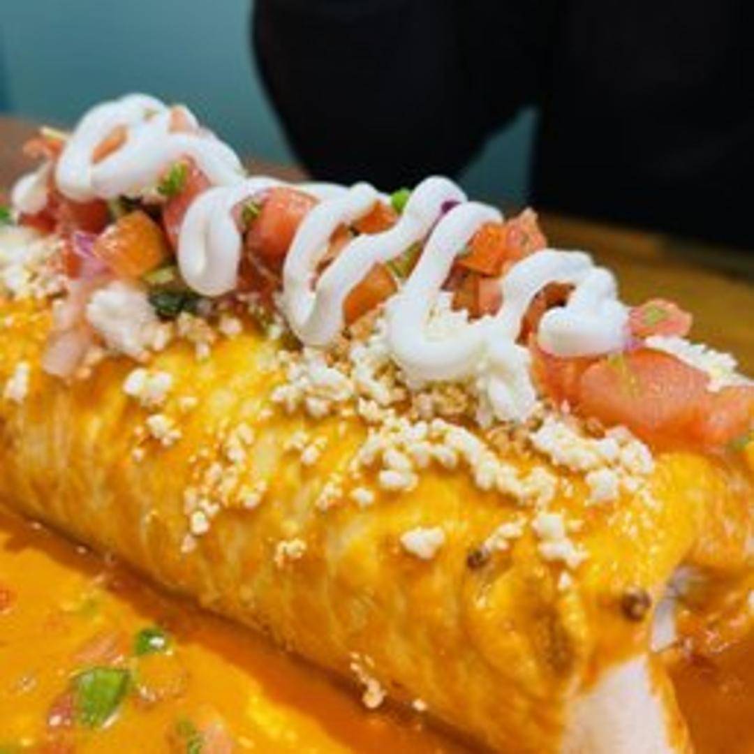 A large flour tortilla filled with your choice of meat, rice, beans, and cheese, smothered in your choice of red or green chili sauce and melted cheese, served with a side of sour cream.