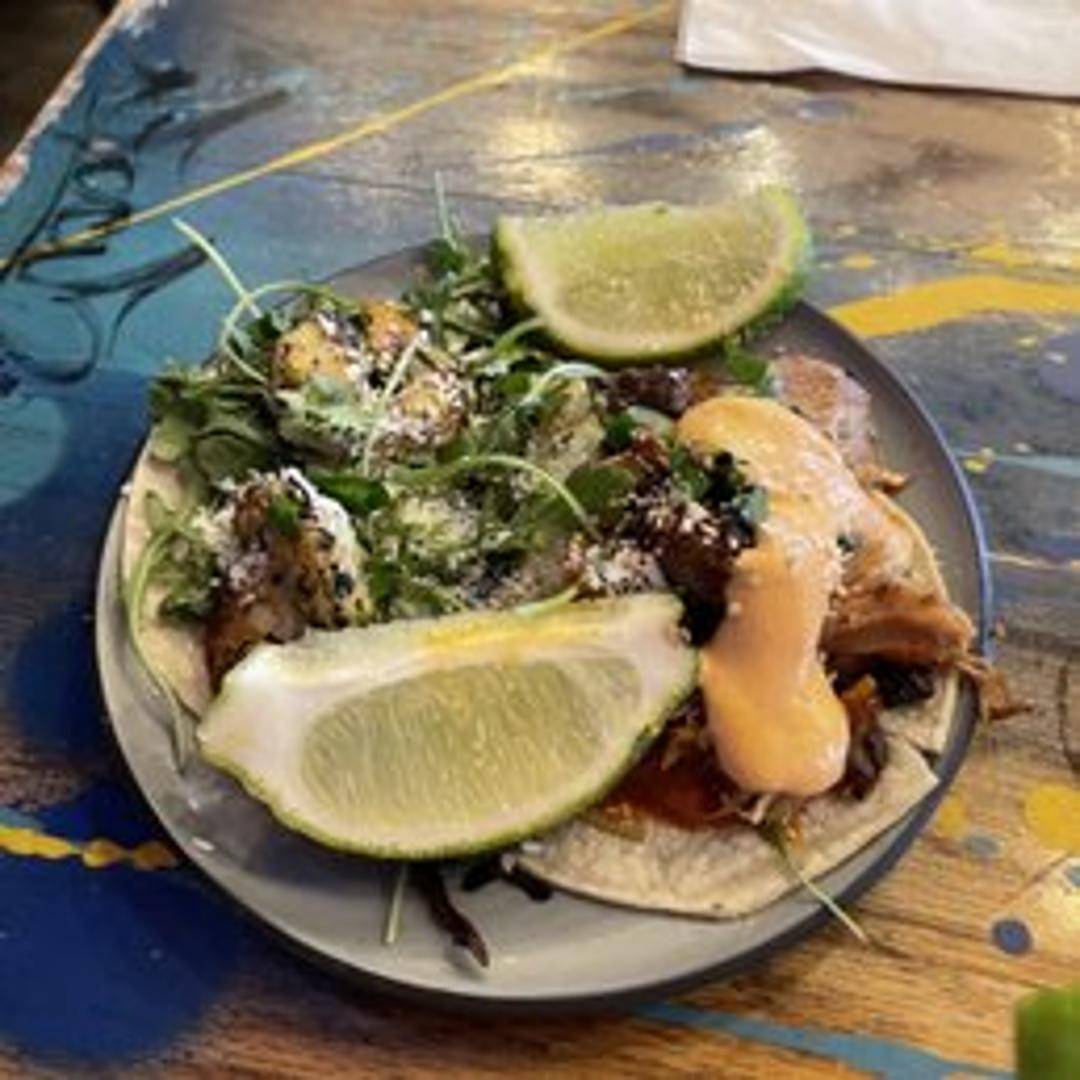 Tacos filled with grilled shrimp, chimi sauce, and fresh toppings.
