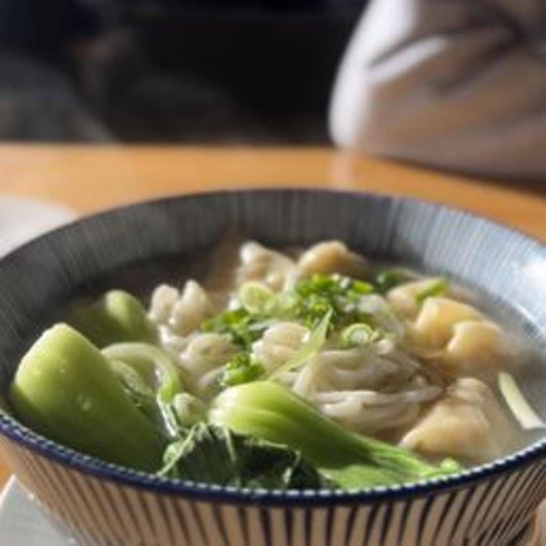 A comforting and flavorful soup featuring delicate wontons filled with savory pork and shrimp, served in a rich broth with thin egg noodles and garnished with fresh greens.