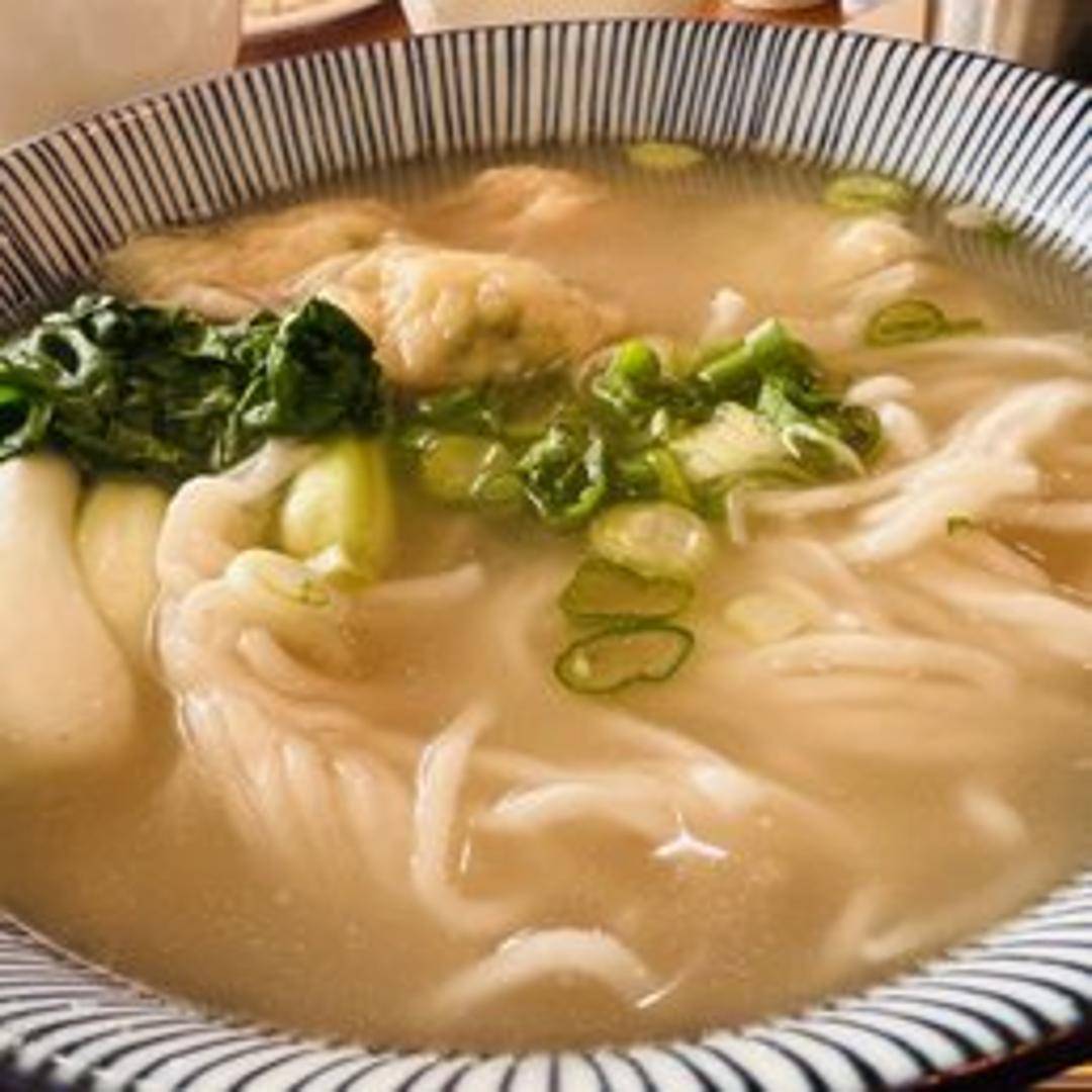 A comforting soup featuring tender beef-filled wontons in a flavorful broth. Garnished with scallions and often includes leafy greens such as bok choy or spinach.