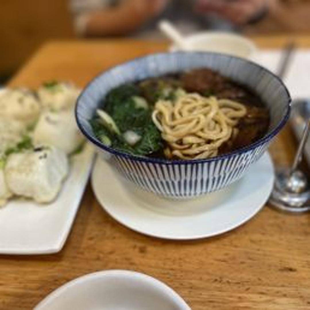 A hearty and comforting Taiwanese noodle soup featuring tender braised beef, wheat noodles, and a rich, flavorful broth. The broth is typically made with beef bones, soy sauce, spices, and aromatics, creating a deep and savory flavor. Often garnished with pickled mustard greens and scallions.