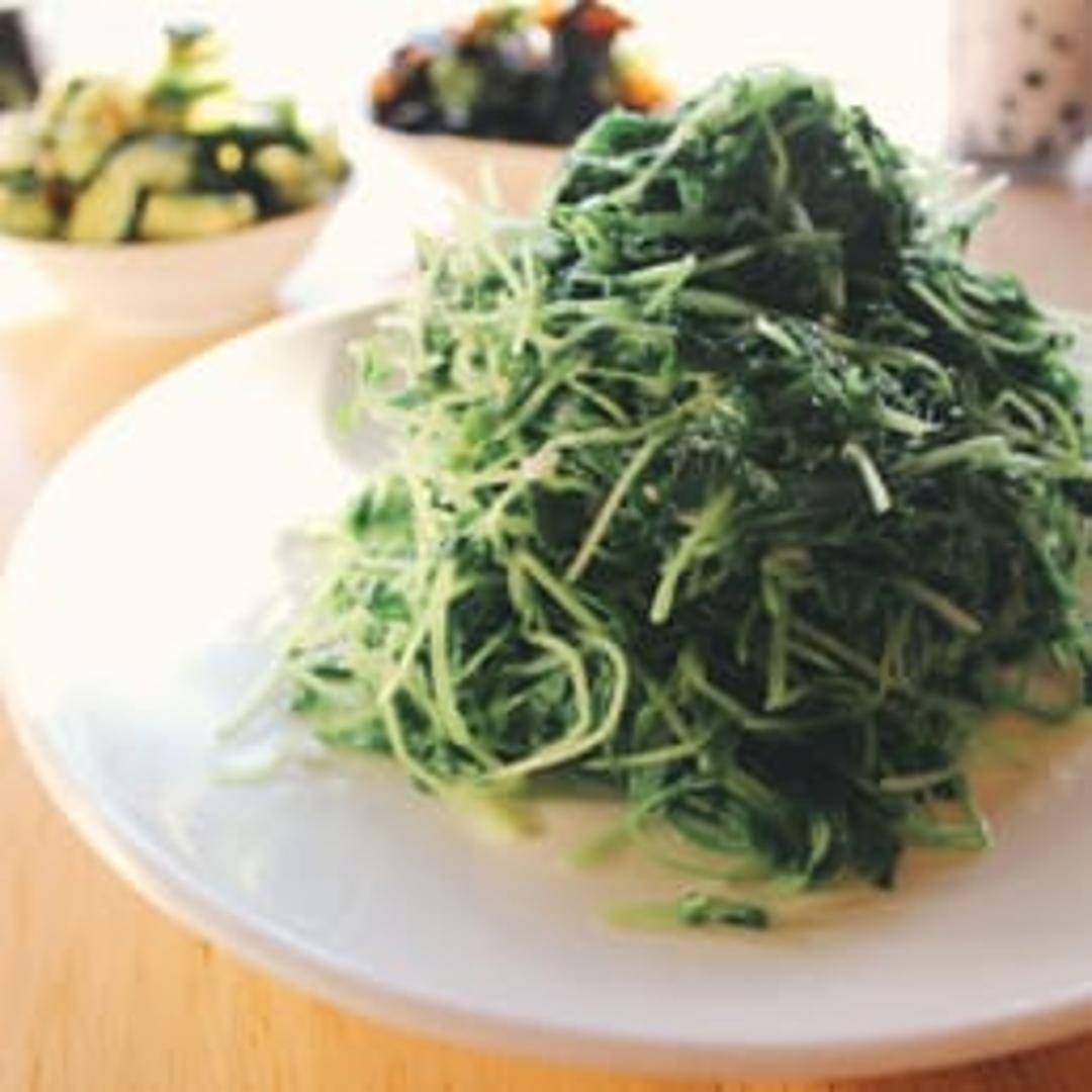 Tender and vibrant pea shoots, stir-fried to perfection and lightly seasoned. A simple yet flavorful dish showcasing the fresh, natural sweetness of the vegetable.