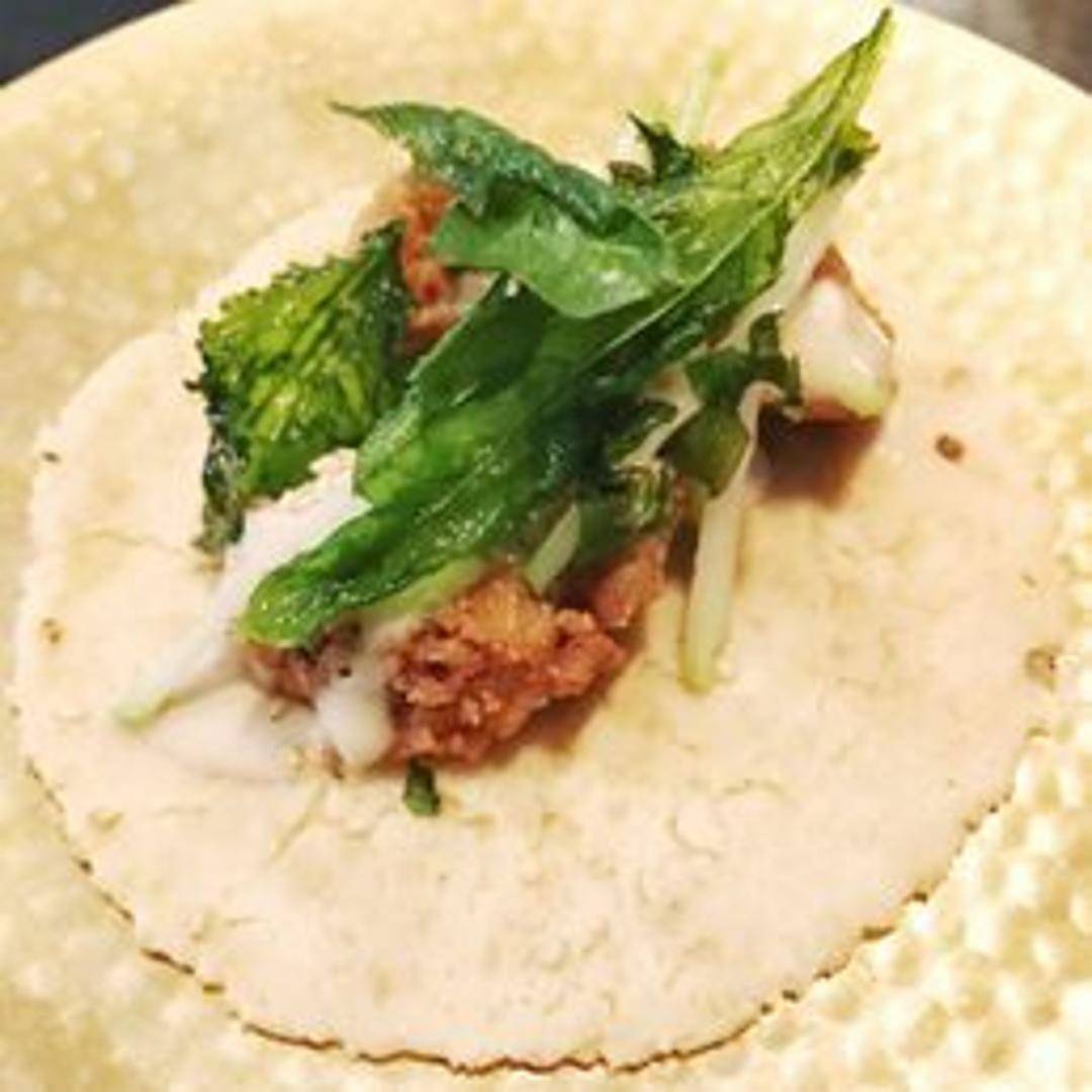 A luxurious and refined interpretation of a taco, showcasing exquisitely prepared veal sweetbreads, perhaps seared to a golden crisp while remaining tender within, nestled in a delicate, hand-pressed tortilla or a bespoke savory crisp, elegantly adorned with vibrant, fresh accompaniments and a sophisticated sauce.