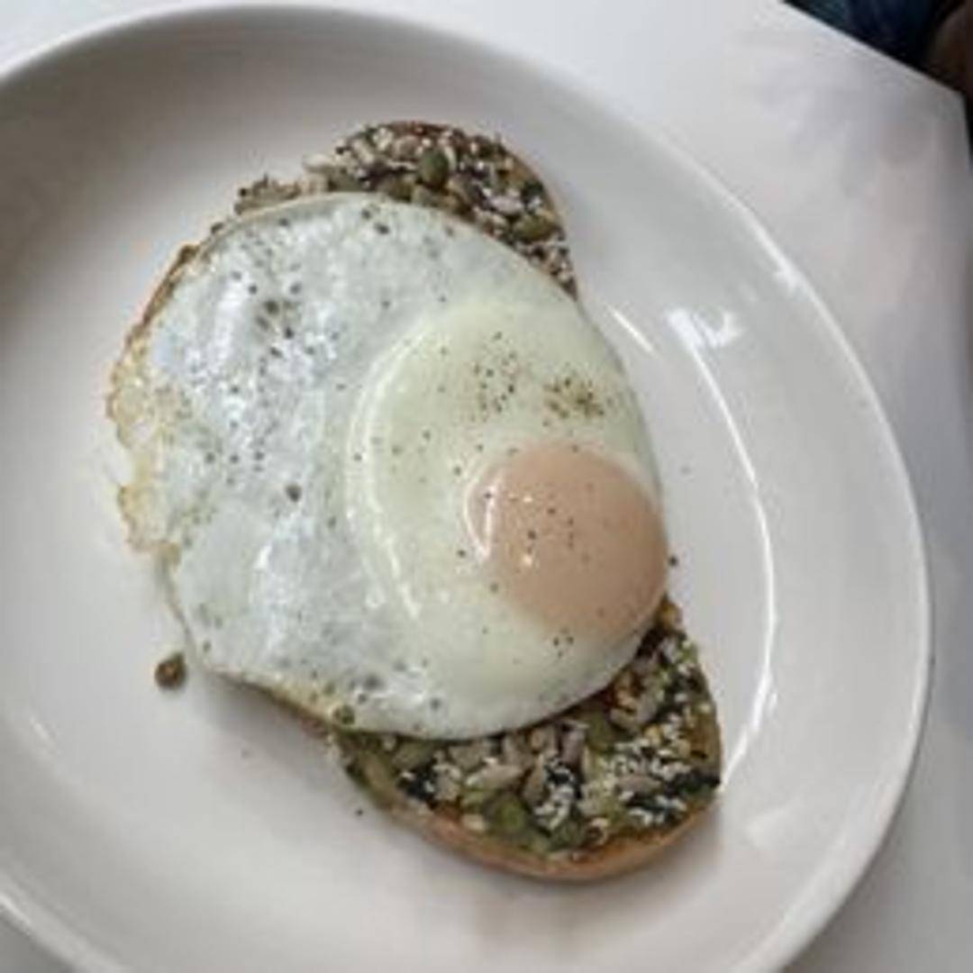 Toasted multigrain bread topped with mashed avocado, sprinkled with everything bagel seasoning, and a drizzle of olive oil. Garnished with red pepper flakes.