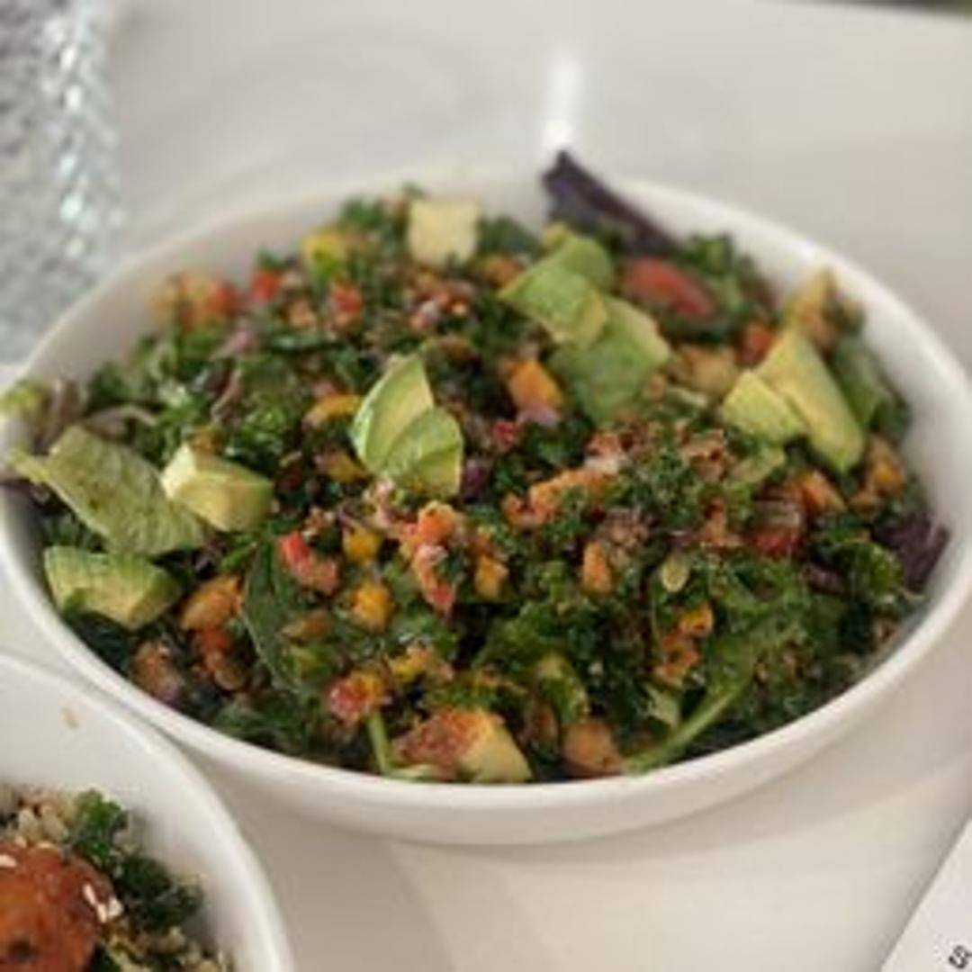 A hearty and refreshing salad with chopped romaine lettuce, grilled chicken or chickpeas, hard-boiled egg, tomatoes, cucumbers, red onion, and a light vinaigrette dressing.