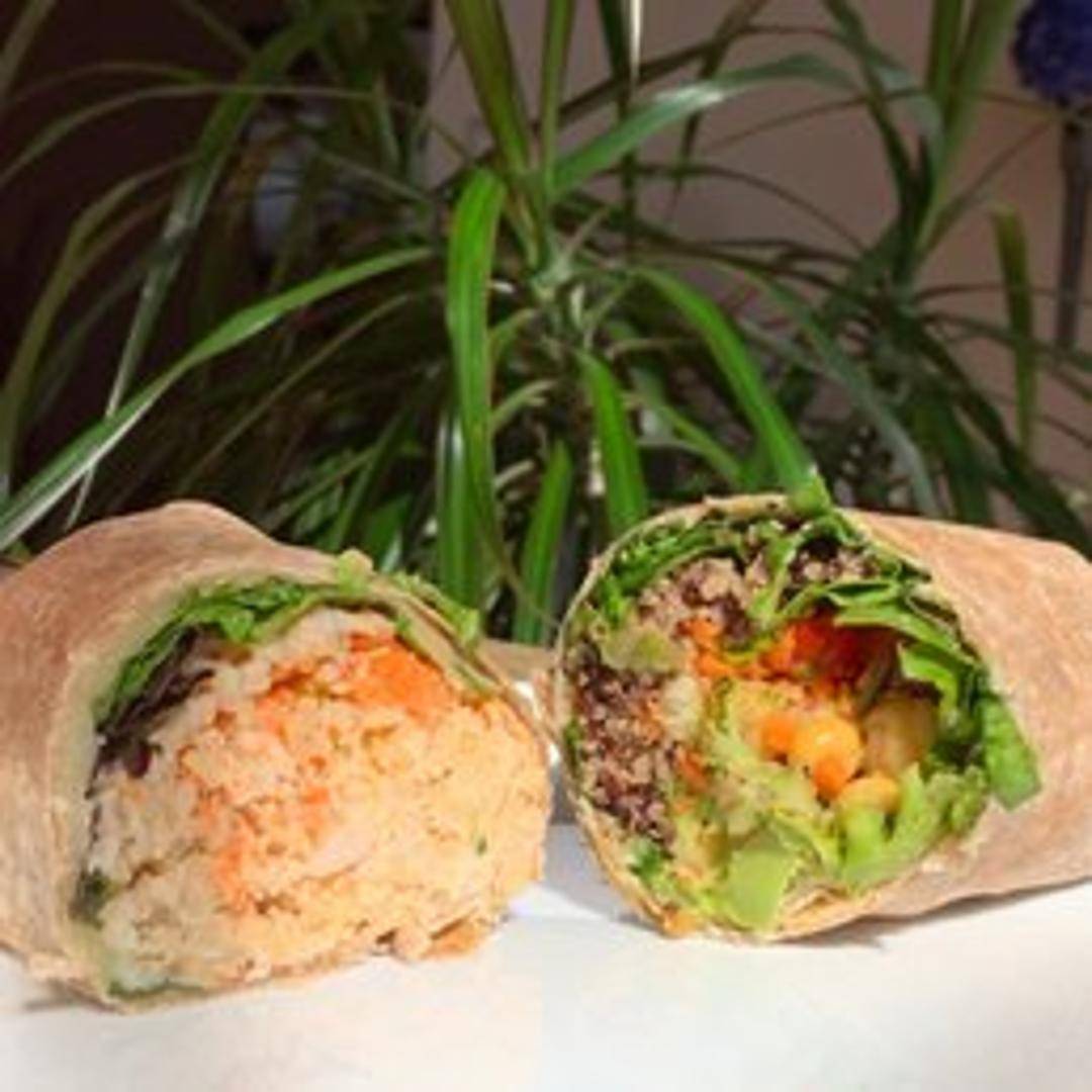 A wholesome wrap filled with a colorful array of fresh vegetables, including crisp lettuce, juicy tomatoes, crunchy carrots, and flavorful peppers. May contain other seasonal vegetables. Combined with a delicious hummus spread or light vegan dressing, all wrapped in a soft tortilla. A convenient and satisfying vegetarian choice.