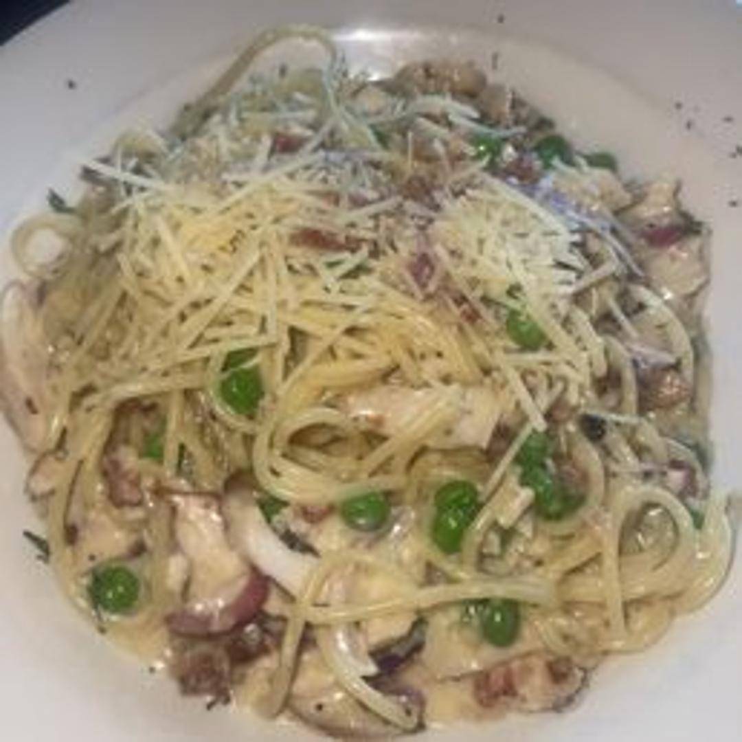 Classic pasta dish with creamy sauce made from eggs, Parmesan cheese, pancetta or bacon, and black pepper.
