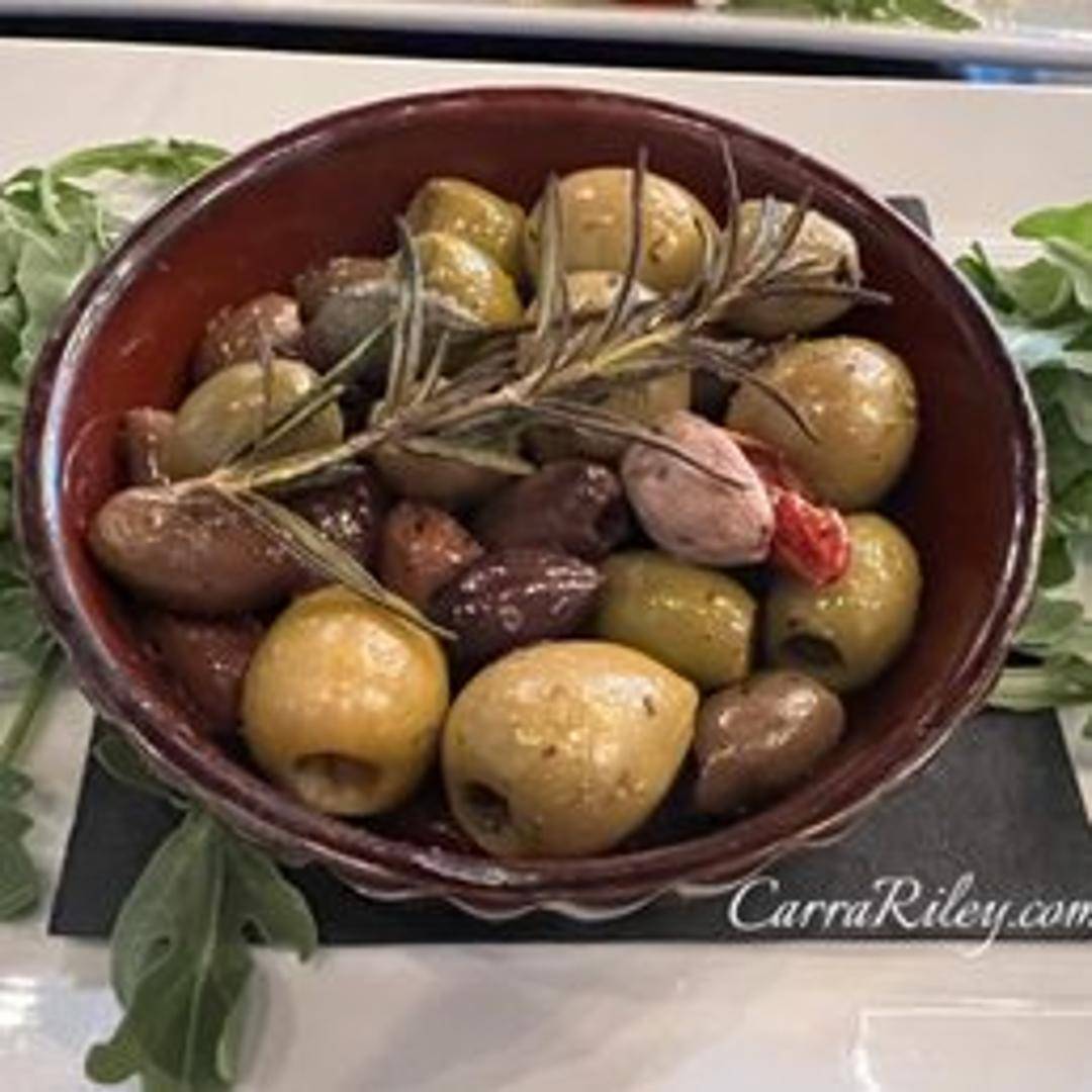 Selection of Mediterranean olives baked with herbs and olive oil. Served warm.