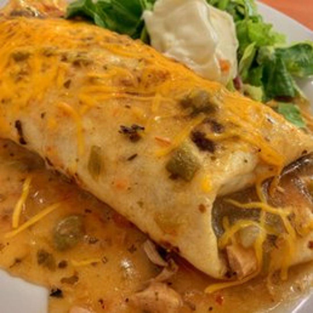 A hearty and filling burrito loaded with your choice of savory filling (options may include seasoned ground beef, shredded chicken, slow-cooked pork, or vegetarian black beans). It's then smothered in Pistachio's signature homemade green chili, topped with melted cheese, sour cream, and pico de gallo. A truly satisfying breakfast or lunch option.