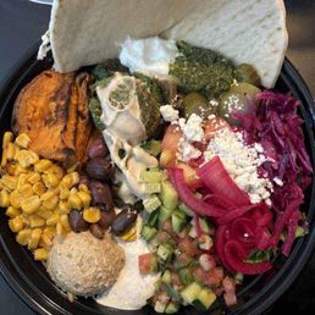 A vibrant bowl featuring crispy falafel, a blend of fresh greens, your choice of grains or base, flavorful toppings like hummus, tahini, and pickled vegetables, and a drizzle of our signature sauces. Customizable to your liking with various toppings and dressings.
