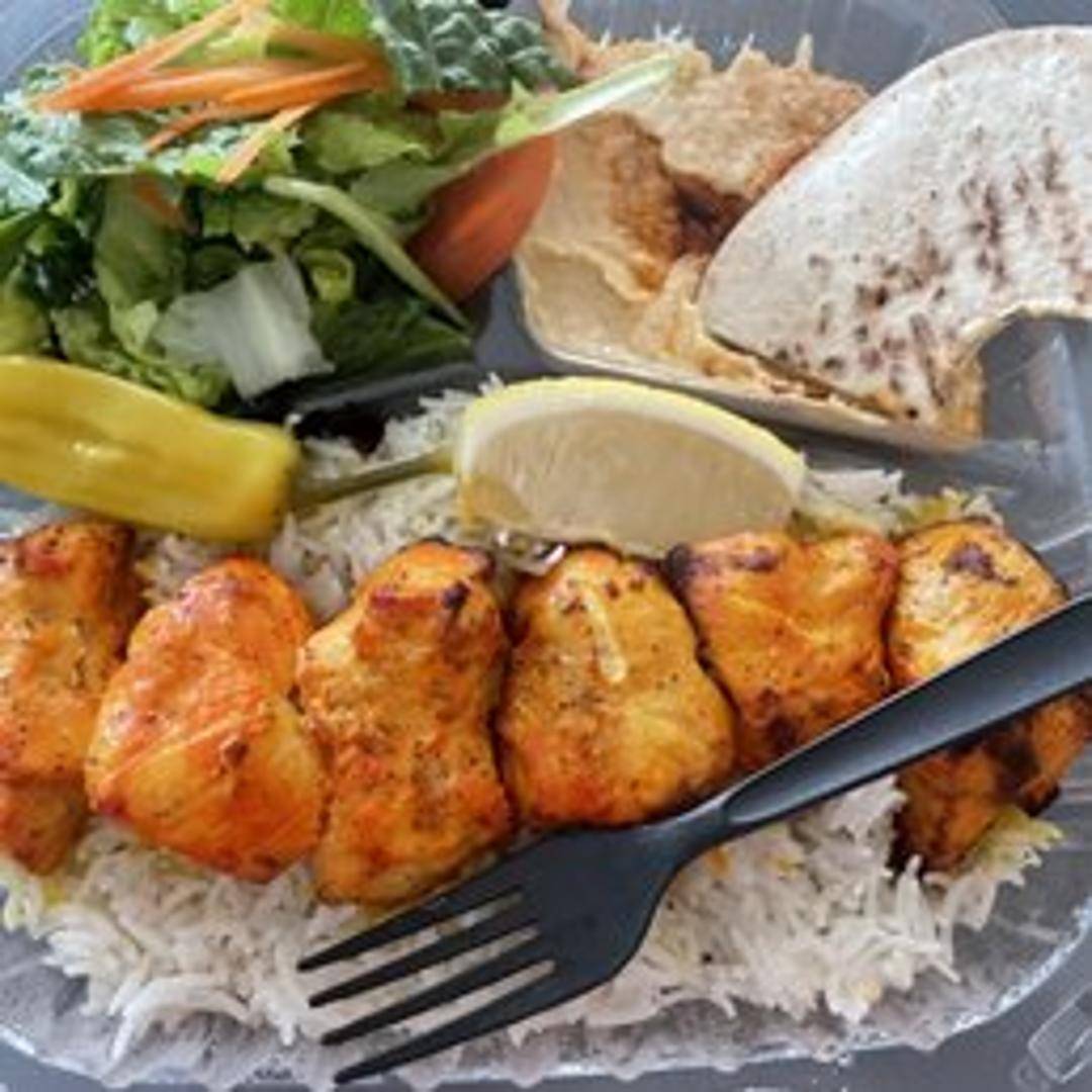 Tender, marinated chicken kabob skewers, grilled to perfection. Served with your choice of rice or salad, and a side of hummus and pita bread.
