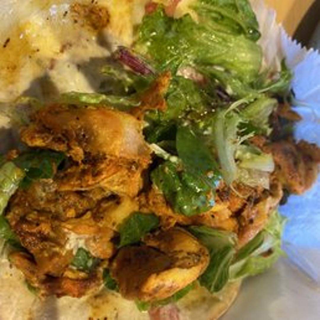 Thinly sliced, marinated chicken roasted on a vertical spit, wrapped in warm pita bread with pickles, lettuce, tomatoes, onions, and tahini sauce.