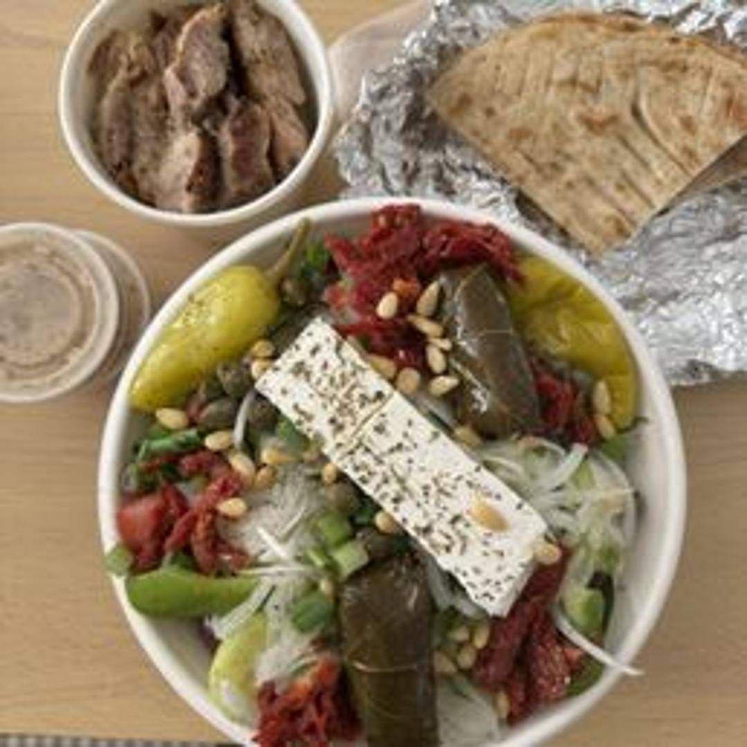 A refreshing and vibrant salad featuring crisp romaine lettuce, juicy tomatoes, cucumbers, red onions, Kalamata olives, and feta cheese. Dressed with a simple yet flavorful Greek vinaigrette.