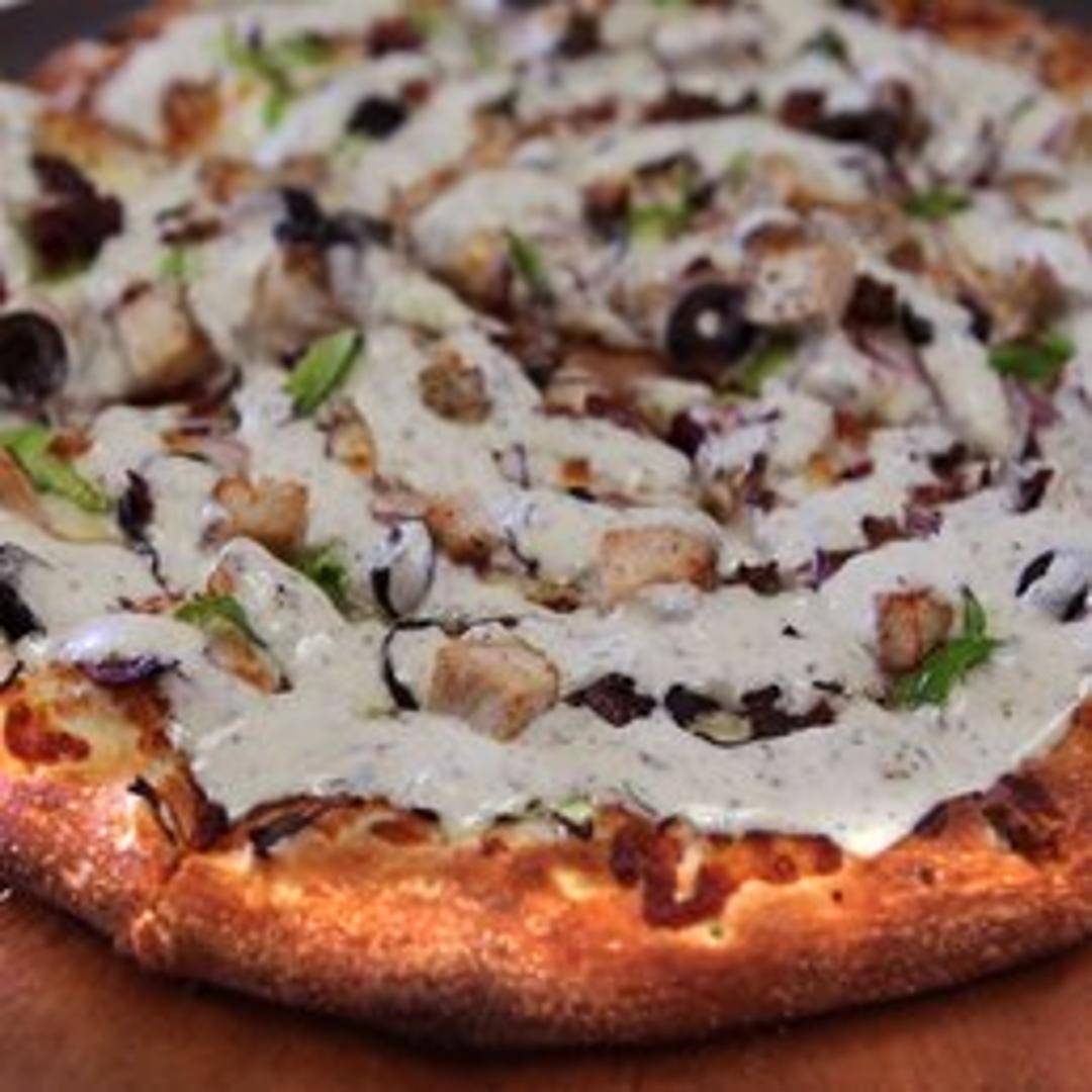 A creamy, tangy delight. Creamy ranch dressing forms the base, topped with grilled chicken, crispy bacon, diced tomatoes, red onions, and a blend of mozzarella and cheddar cheeses. A Pizza Go favorite!
