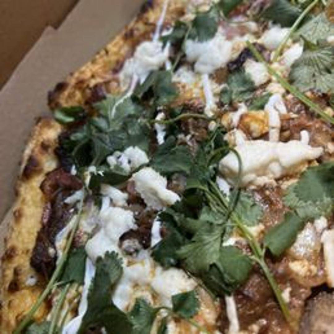 Pizza topped with seasoned ground beef, cheddar cheese, lettuce, tomatoes, onions, salsa and sour cream.