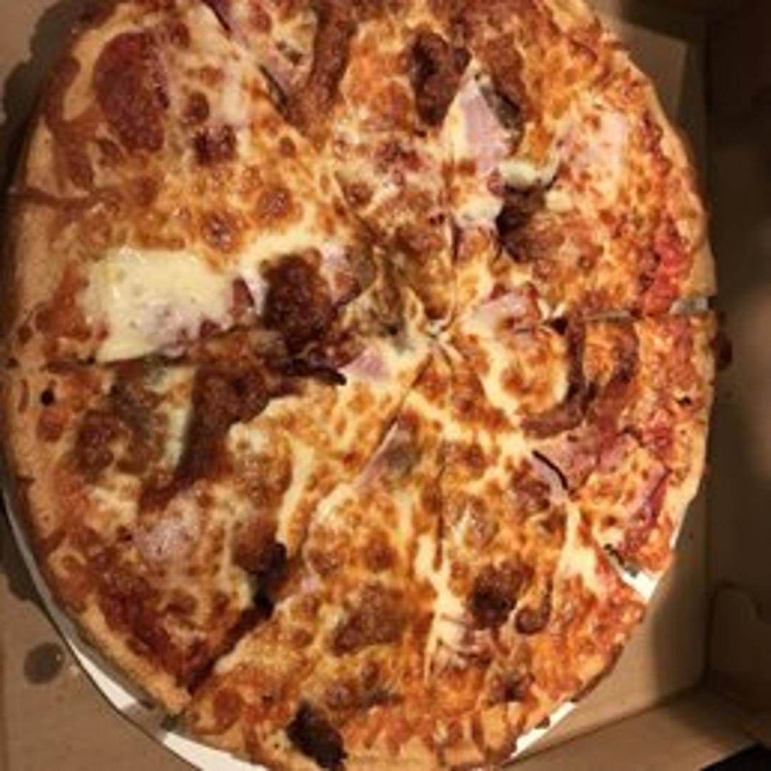 A hearty pizza piled high with a variety of meats, including pepperoni, sausage, ham, and bacon. A satisfying choice for meat enthusiasts.