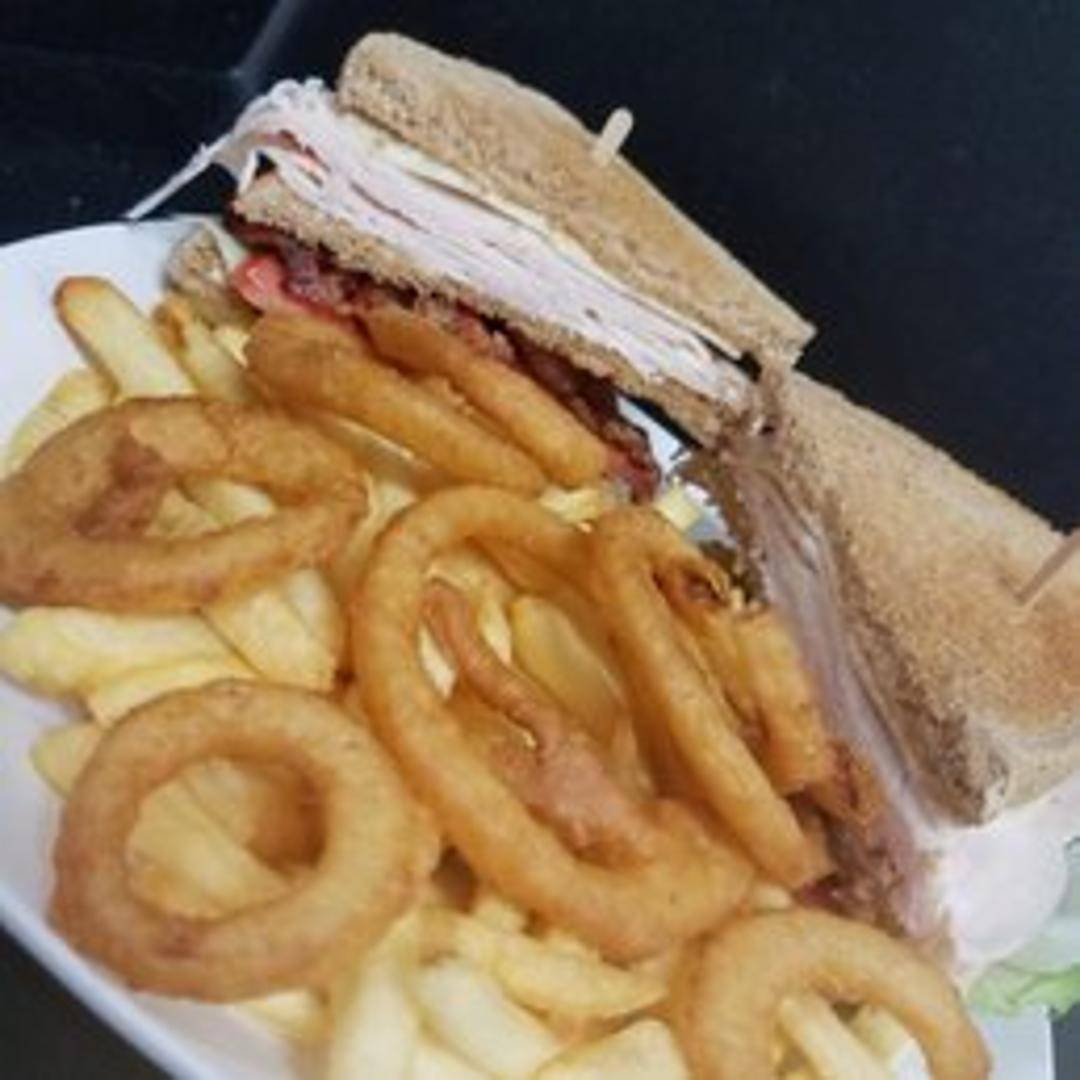 A classic triple-decker sandwich featuring layers of sliced turkey or chicken, crispy bacon, fresh lettuce, ripe tomato, and mayonnaise on toasted bread. Served with your choice of side.