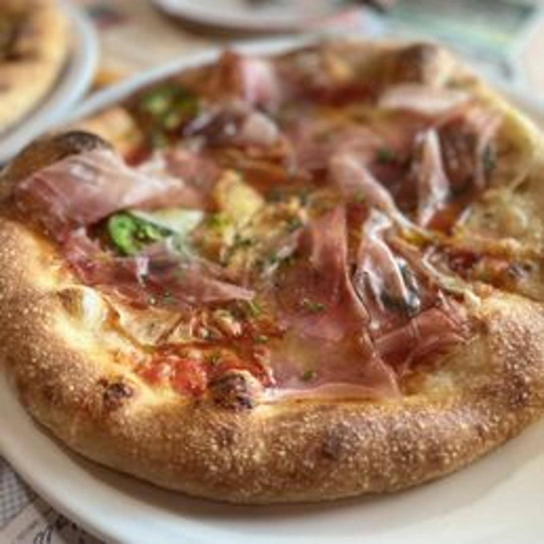A wood-fired pizza featuring a combination of seasonal toppings, often including ingredients like squash blossoms, burrata cheese, and various herbs. The specifics can vary depending on ingredient availability.