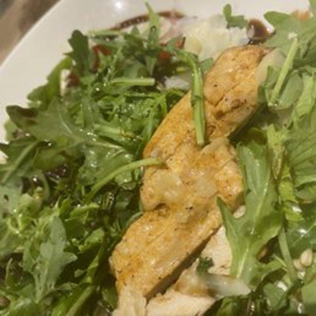 A refreshing and vibrant salad from Pizzeria Omaggio, featuring crisp mixed greens, toasted pine nuts, cherry tomatoes, and thinly sliced red onions, all tossed in a light, zesty vinaigrette. A perfect, healthful complement to any meal.