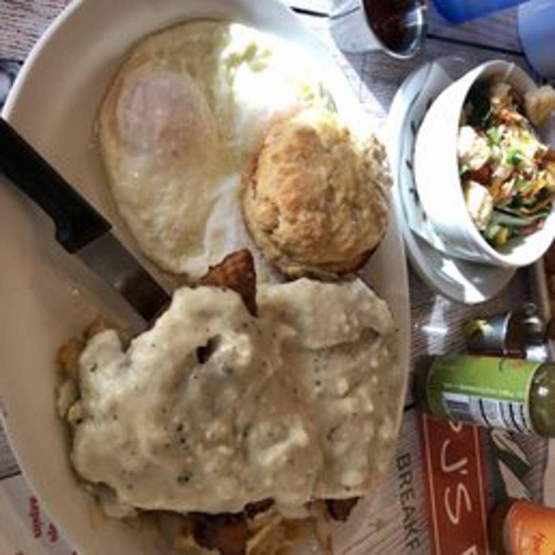 A generous portion of steak and eggs cooked to your liking, served with crispy hash browns and your choice of toast or a biscuit.