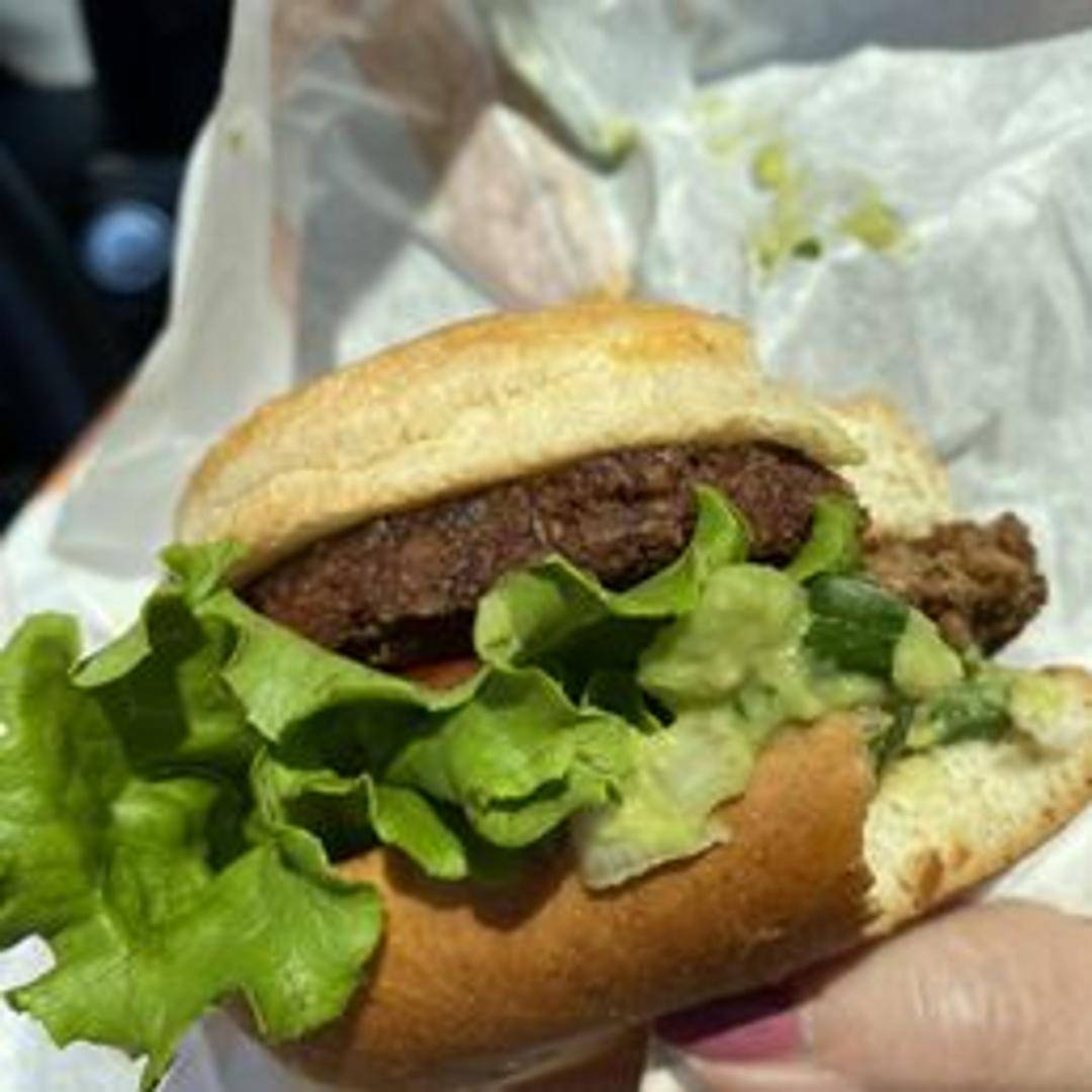 A plant-based burger patty topped with melted cheese, guacamole, lettuce, tomato, and onion on a toasted bun.