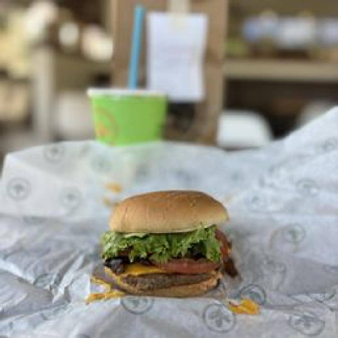 A plant-based burger patty topped with melted cheese, lettuce, tomato, onion, and special sauce on a toasted bun.