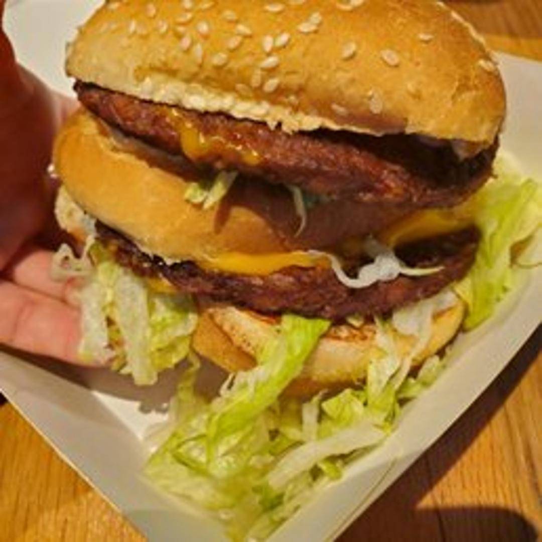 Two juicy, seasoned plant-based burger patties, stacked high with lettuce, tomato, special sauce, cheese, onions, and pickles on a sesame seed bun. A towering, flavor-packed vegan take on a fast-food favorite.