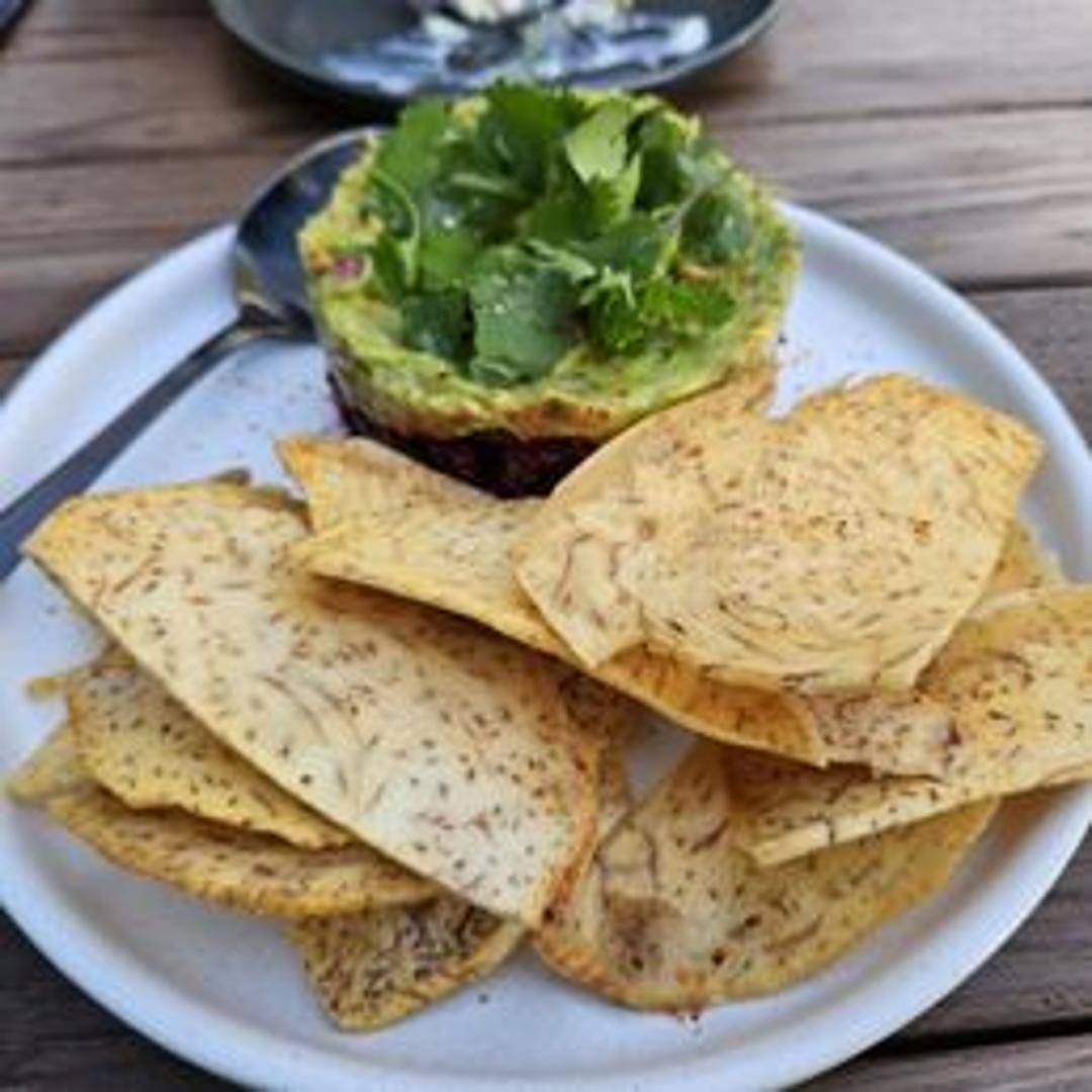 Diced avocado mixed with lime juice, cilantro, and other fresh ingredients, served with crispy plantain chips for dipping.