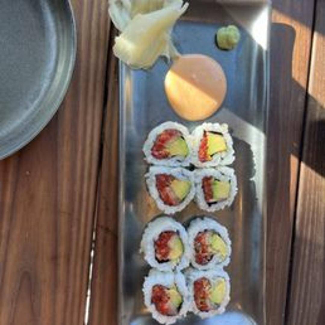 A plant-based sushi roll with ahi watermelon 'tuna,' avocado, cucumber, and a spicy mayo. Delivers a refreshing taste of the ocean with spicy flavors, and a blend of textures from the soft watermelon to the crunchy cucumber.