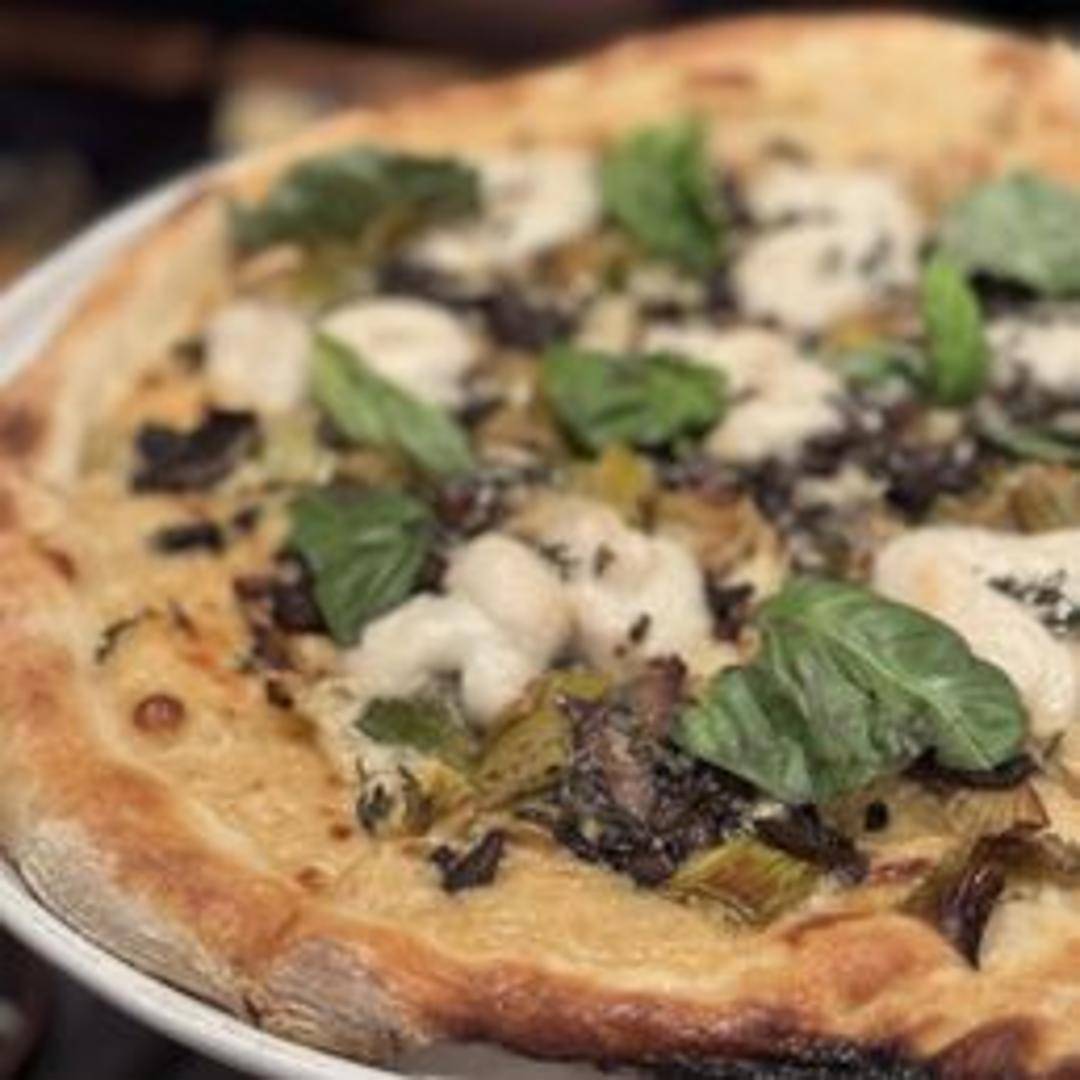 A delicate and flavorful pizza featuring a creamy white sauce base, thinly sliced leeks, garlic, and a blend of plant-based cheeses. Baked to bubbly perfection, creating a sophisticated and aromatic pizza experience.