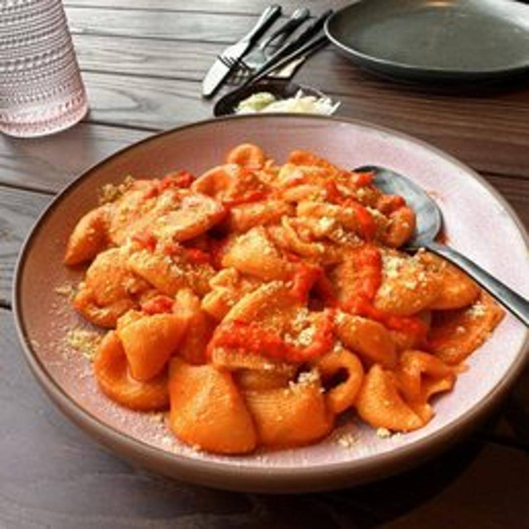 Large pasta shells (lumaconi) tossed in a spicy tomato-based sauce with plant-based sausage and fresh herbs. Finished with vegan parmesan.