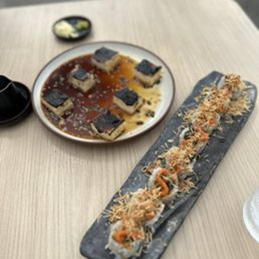 Pan-fried or grilled tofu marinated in a rich and savory black garlic sauce, providing a complex umami flavor. Served with accompaniments that complement the rich, garlicky notes, such as fresh herbs or vegetables.