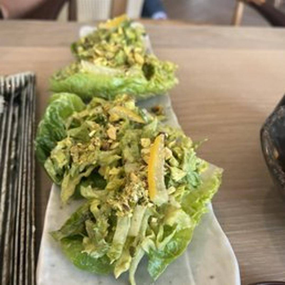 Crisp romaine lettuce cups filled with a creamy, plant-based Caesar dressing, topped with herb croutons and parmesan.